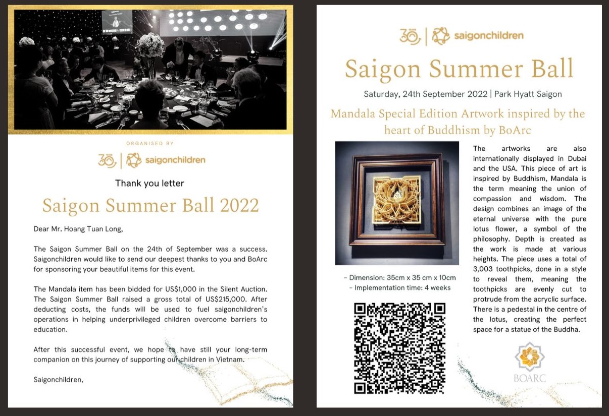 Vào ngày 24/9 vừa qua, BOARC đã gửi tác phẩm của mình đến sự kiện “Saigon Summer Ball 2022” được Saigon Children’s Charity tổ chức tại Park Hyatt với 260 khách quý tham dự. Đây là một tổ chức phi lợi nhuận được thành lập từ năm 1992 nhằm giúp trẻ em Việt Nam có hoàn cảnh khó khăn được tiếp cận giáo dục và có sự khởi đầu tốt hơn trong cuộc sống. Sự kiện “Saigon Summer Ball 2022” là một bữa tiệc gây quỹ đồng thời đánh dấu chặng đường 30 năm của tổ chức trong hành trình giúp trẻ em và thanh thiếu niên khó khăn tiếp cận với giáo dục chất lượng và công bằng.