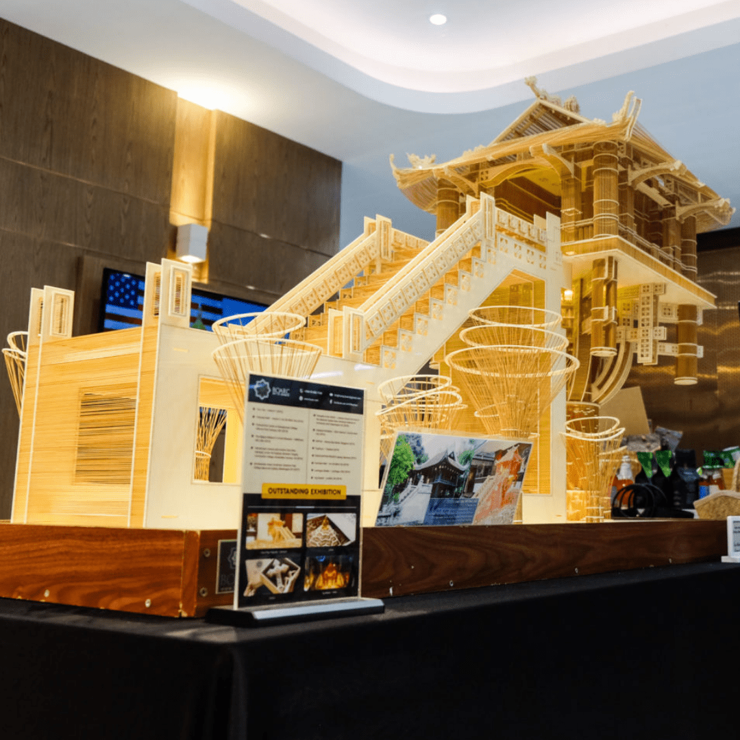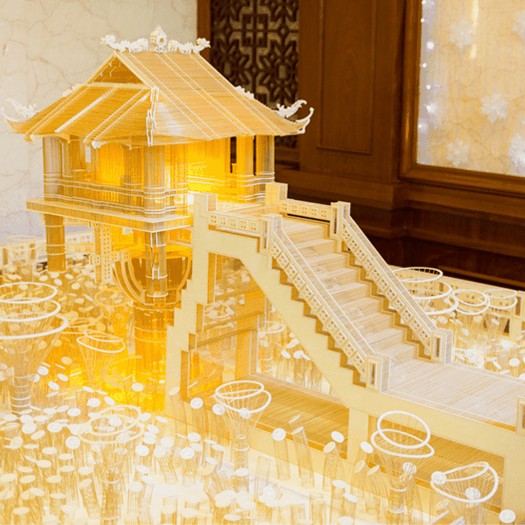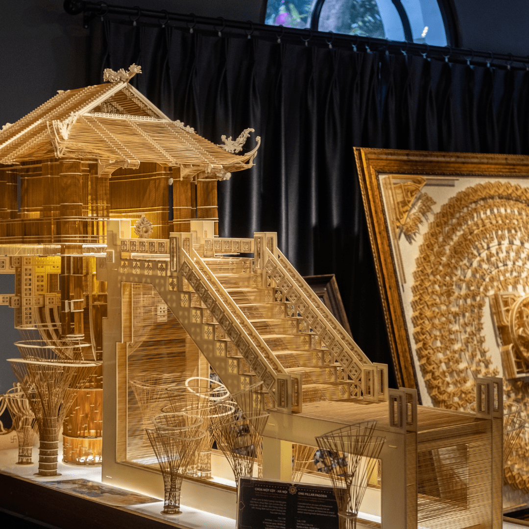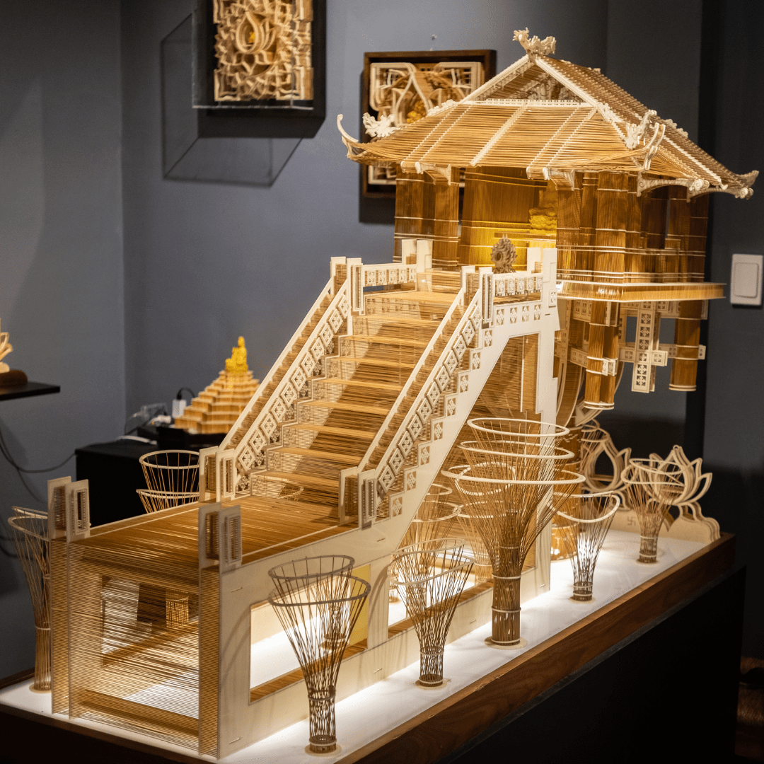 From stories, historical imprints, and also a challenge when making a big project with BoArc art. Through many months of research and design, Artist LongHoang has gradually shaped the architecture of the 1-pillar pagoda with tens of thousands of Giang toothpicks. After 7 months of implementation, the 1-pillar pagoda in the middle of a stylized lotus lake was completed with more than 120,000 toothpicks. In 2016, the work was honored to receive the Vietnamese record for the largest toothpick temple and then a series of domestic and foreign exhibitions. The record-breaking 1-pillar pagoda is currently located in the state of Maryland - USA This is also a typical work in the project "Recreating Vietnamese and world heritage with BOARC art"