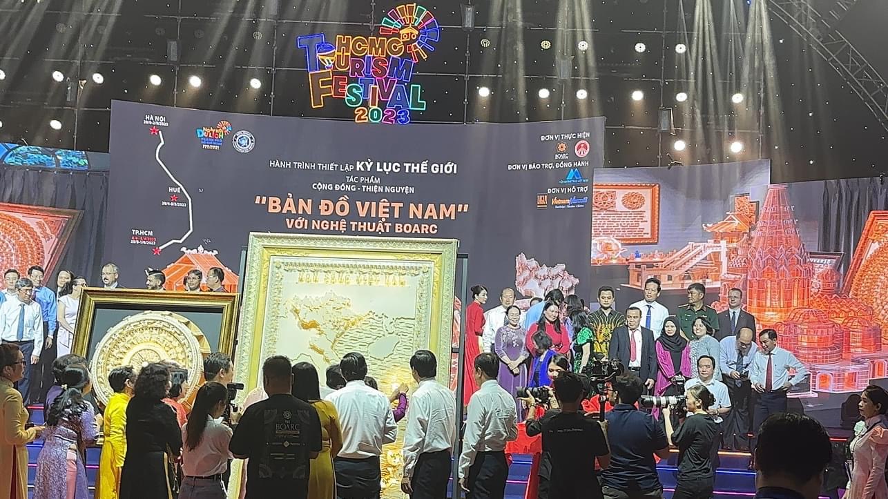 Especially, coming to this 19th Ho Chi Minh City Tourism Festival, Boarc collaborated with the Festival organizers to launch the work "MAP OF VIETNAM" with toothpicks in the series "Vietnamese soul" with the message: CONNECTED - PROUD - LOVE. The work consists of two parts: Vietnam map and Dong Son kettledrum. The size is about 1.8m x 2.8m with more than 100,000 toothpicks made by 2,000 - 10,000 people. After a period of implementation in Ho Chi Minh City, the work will be moved to Hue and Hanoi to continue the journey to set a world record. The work is expected to register a world record with the criteria: One is the map with the most participants in the world, the other is the map of Vietnam with the largest toothpick in the world.